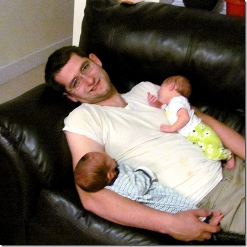 Mom and Dad have been doing a good job managing the double action. I can’t believe this is the only shot of Ben with his babies that I took. He was pretty tired when I arrived. He’s a good Dad, working, helping with the twins and still playing with Elaine and Nolan and reading to them and helping get them into bed.